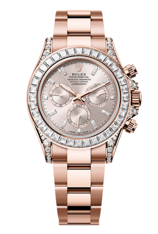 Cosmograph Daytona Oyster, 40 mm, Everose gold and diamonds 126595TBRVendor: RolexThis model features a sundust, diamond-set dial with spray-coated counters, 18 ct gold applique hour markers and hands with a Chromalight display, a highly-legible luminescent material. The dial allows drivers to accurately map out their track times and tactics without fail.