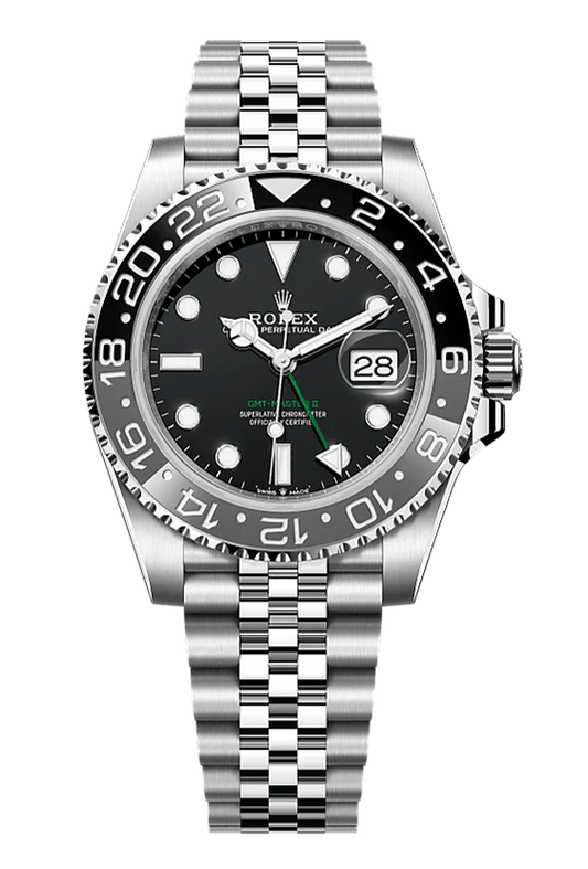 GMT-Master II Oyster, 40 mm, Oystersteel 126710GRNRVendor: RolexThis model features a black dial and a two-colour Cerachrom bezel insert in grey and black ceramic. In addition to conventional hour, minute and seconds hands, the GMT-Master II features an arrow-tipped hand, which circles the dial once every 24 hours, as well as...