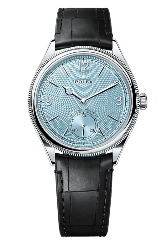 190839 mm, platinum, polished finish 52506Vendor: RolexThe ice blue dial features a guilloché rice-grain motif. This rosette-like design is distinctive for its three-dimensional, repeating geometric pattern that extends across the surface of the dial starting from the small seconds counter at 6 o’clock. The minute track is surrounded by a...