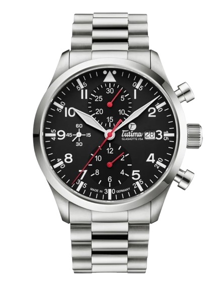 Airport Chronograph 6407-05Vendor: TutimaModern Flieger Chronograph for the 21st centuryMovement Details : Automatic movement chronograph. Rotor rhodanized with gold seal. 25 jewels. Polished screws. Power reserve when fully wound 48 hours. Functions: Date display. Hour, minute, small second, Chronograph 60-second counter, 30-minute counter and 12-hour counter. Sweep...