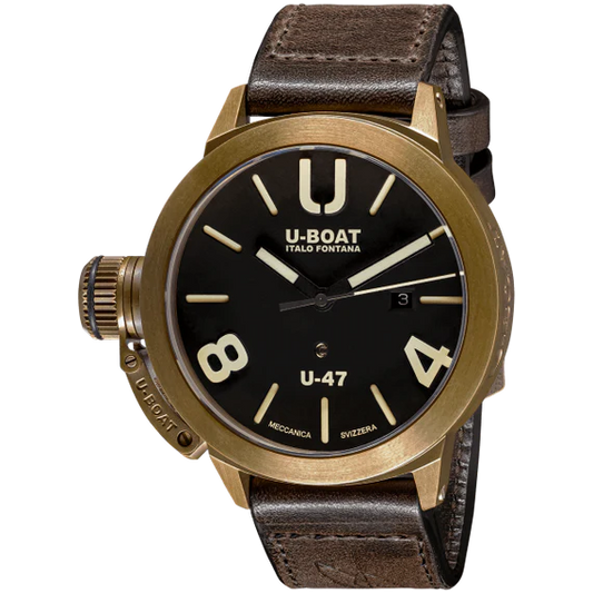 CLASSICO U-47 47MM BRONZE 7797Vendor: U-BoatCase 47mm Bronze.MOVEMENTautomatic mechanical personalized to U-BOAT specifications for stem to be positioned at 9 o’clock. Frequency: 28 800 vibrations per hour 4 Hz. Power reserve: 41 hours. 26 jewels. Skeletonized rotor as by U-BOAT specifications.DIALthree superimposed layers matt black with visible ruby. Luminous...