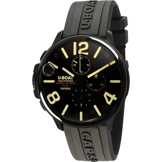 CAPSOIL CHRONO 45MM DLC 8109/DVendor: U-BoatThe 45mm steel case houses state-of-the-art electromechanics enriched with chronograph functions completely immersed in an oil bath. This technological solution not only ensures greater durability and precision over time but also lends an extraordinary aesthetic to the dial.MOVEMENTswiss electro-mechanical movement lubricated with oil bath...