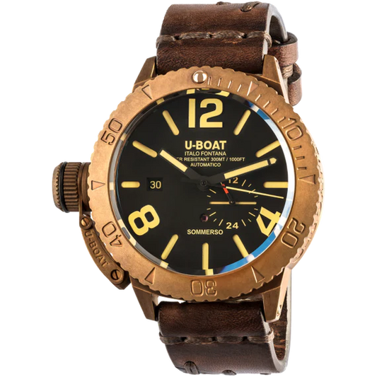 SOMMERSO 46MM BRONZO 8486Vendor: U-BoatThe unique shades of natural bronze joined with the technical specifications for professional diving are the main features of this dive watch with an exuberant design.MOVEMENTSellita SW 200 swiss automatic mechanical personalized to U-BOAT specifications. Frequency: 28 800 vibrations per hour. Power reserve: 41...