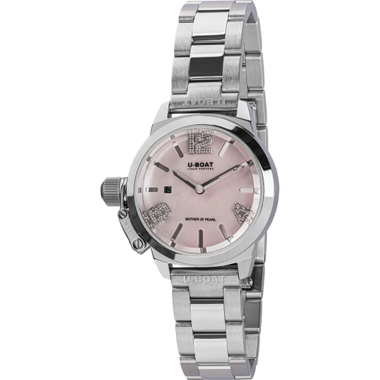 CLASSICO LADY 30MM PINK 8898Vendor: U-BoatWith a diameter of 30 mm the new Classic Lady.MOVEMENTthe Swiss precision of the Ronda 774 quartz movement.DIALthree superimposed dials the lower one in shiny metal the upper one in mother of pearl with 36 white diamonds set on indexes 12/4/8 (ct.0.08 tot.). Perforated...