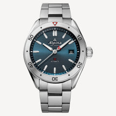 The Alpiner 4 Automatic sport watch features the AL-525 automatic movement, and is anti-magnetic, anti-shock, and water-resistant to 100M. Brushed and polished stainless steel 2-part 40mm case, with a scratch resistant convex sapphire crystal and an engraved case back. Blue dial with sunray finishing and horizontal line pattern. Blue outer ring with white graduations, applied silver color indexes, and hour and minute hands filled with white luminous treatment. Silver color second hand with red triangle. Date window at 3 o'clock. Comes on a brushed and polished 3 link stainless steel bracelet with folding buckle.