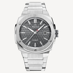 The Alpiner Extreme Automatic is a 41 x 42.5mm rugged sport watch. At the heart of the design, a strong brushed-finish cushion case featuring a grey dial with triangle pattern, and a grey outer ring with white markers and applied silver indexes filled with white luminous treatment. Date window at 3 o'clock. Hand-polished silver color hour and minute hands also filled with white luminous treatment. Polished silver color second hand with signature Alpina red triangle. Set on a stainless steel bracelet with folding buckle and housing the AL-525 caliber automatic movement, this timepiece is water resistant to 200M.