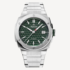 The Alpiner Extreme Automatic is a 39 x 40.5mm rugged sport watch. At the heart of the design, a strong brushed-finish cushion case featuring a green dial with triangle pattern, and white markers with applied silver indexes filled with white luminous treatment. Date window at 3 o'clock. Hand-polished silver color hour and minute hands also filled with white luminous treatment. Polished silver color second hand with signature Alpina red triangle. Set on a stainless steel bracelet with folding buckle and housing the AL-525 caliber automatic movement, this timepiece is water resistant to 200M.