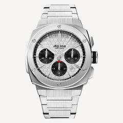 The Alpiner Extreme Chronograph Automatic features the AL-730 caliber, automatic movement with a 62-hour power reserve. Brushed and polished stainless steel 41mm, 3-part case. Anti-reflective sapphire crystal, water resistant to 100M, and an engraved see-through case-back. Silver dial with triangle pattern, applied silver indexes filled with white luminous treatment, silver color hour and minute hands, black outer ring with white chronograph seconds graduation. Silver color chronograph second hand with red triangle, black chronograph 30 minute counter at 3 o'clock, black chronograph 12 hours counter at 6 o'clock and a black 60 seconds counter at 9 o'clock all with silver hand and white graduation. Date window between 4 and 5 o'clock. Brushed and polished stainless steel bracelet with folding buckle and push buttons.