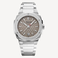 The Alpiner Extreme styles are now available in a smaller unisex size of 34 x 35.20mm, and for the first time feature a quartz movement. At the heart of the bold design, a strong brushed-finish cushion case featuring a beige dial with signature triangle pattern and white markers with applied silver indexes filled with white luminous treatment. Seconds hand features signature Alpina red triangle. Date window at 6 o'clock, WR to 100M. Set on a stainless steel bracelet with folding buckle and push buttons.