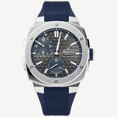 The Alpiner Extreme Regulator Automatic is the perfect rugged sport watch. Separate display of the hours, minutes and seconds, set inside a heavy-duty 41mm case with see-through back, and able to withstand extreme conditions. Dark grey dial with triangle pattern, navy outer ring with white markers. Navy blue hour counter at 10 o'clock, hand-polished silver color hour and minute hands. Navy blue second counter at 6 o'clock. Silver color second hand. Navy blue rubber strap. WR up to 200M.