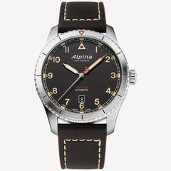 The Alpina Startimer Automatic, inspired by its heritage look and incomparable precision, features a 41mm brushed and polished 2-part stainless steel case and notched bezel, designed in the early days of aviation, making it easier to grip with gloves. WR to 100M, with a black dial featuring a date window at 6 o'clock. Outer ring with seconds graduation. Set on a black calfskin leather strap, adorned with top-stitching in a beige matching the index markers. Perfect for the aviator at heart.