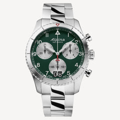 The Startimer Pilot Quartz Chronograph Big Date comes on a brushed and polished 41mm stainless steel case featuring a chronograph at 3 o'clock, a seconds counter at 6 o'clock along and a chronograph with 30 minutes counter at 9 o'clock. The green dial has applied silver tone Arabic numbers, silver-tone hour and minute hands filled with silver-tone luminous treatment, a silver-tone chronograph second hand with the signature Alpina red triangle, and a big date window at 6 o'clock. Set on a stainless steel 3-link bracelet, it is water resistant to 100M.
