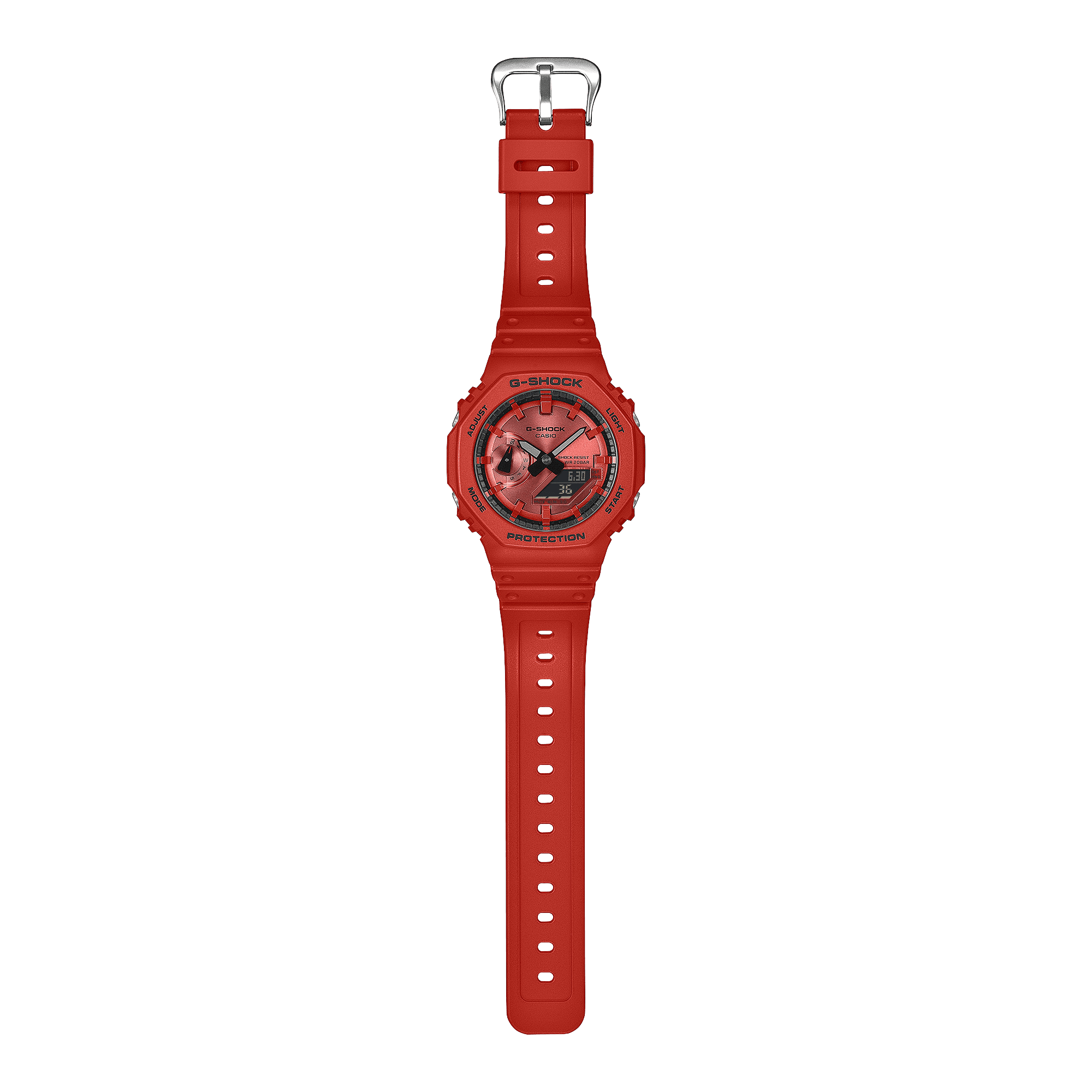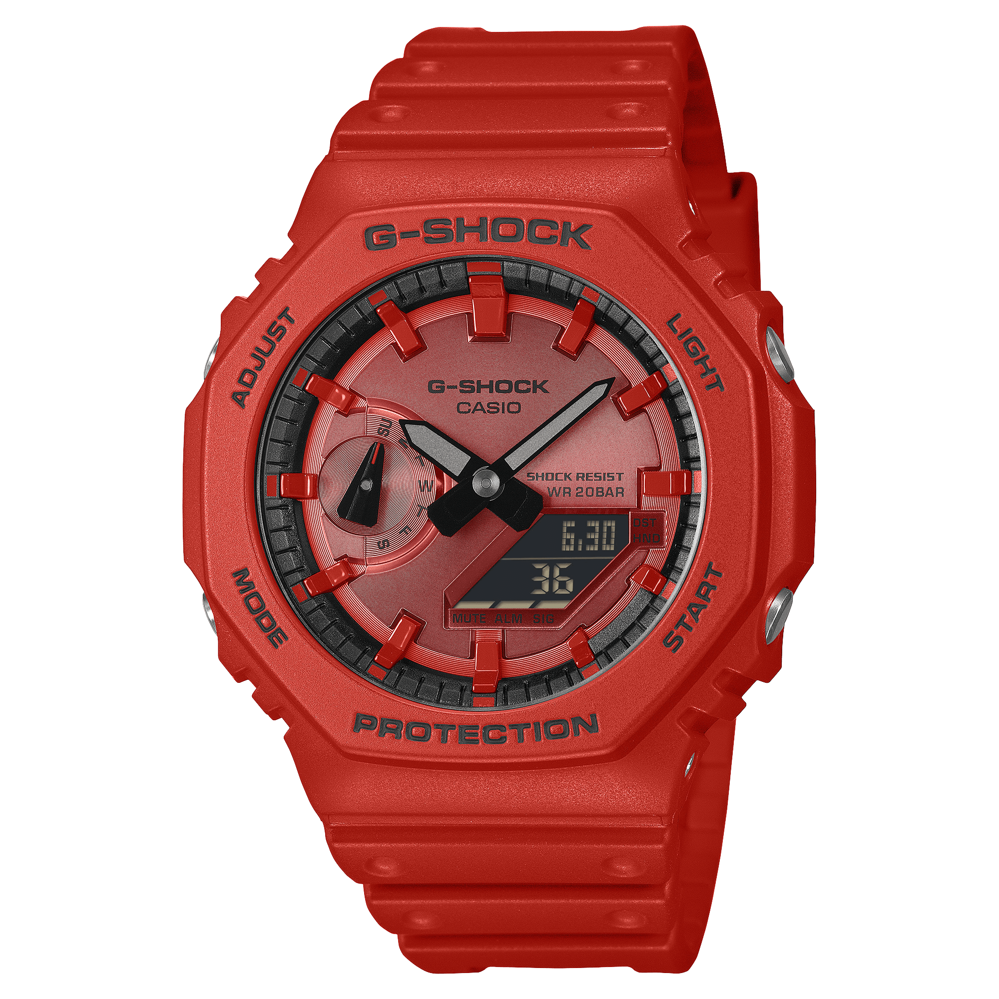 Indulge your passion for bold, bright toughness with an iconic G-SHOCK style in the vivid red loved by trendsetters and athletes the world over. Introducing four iconic styles in G-SHOCK brand red: the ever-popular 5600, a direct legacy of the first-ever G-SHOCK; the 6900, a timeless cultural icon still loved by people of all ages; the 110 with strong, bold oversized case; and the streamlined beauty of the 2100 with octagonal bezel. Treated to a vapor deposition finish in red, the watch face blends seamlessly with the red band and bezel, while the dramatic textural contrast exudes strength and intensity. The inverted LCD and touches of black incorporated throughout the design pop against the vibrant red color scheme, the black accents enhancing the impact of the overall design to convey the uniquely tough G-SHOCK identity. Key resin components for the bezel and band are made with bio-based resin, a material expected to help reduce environmental impact. These vibrant watches make a great accessory for your street-savviest fashions and your most casual styles.