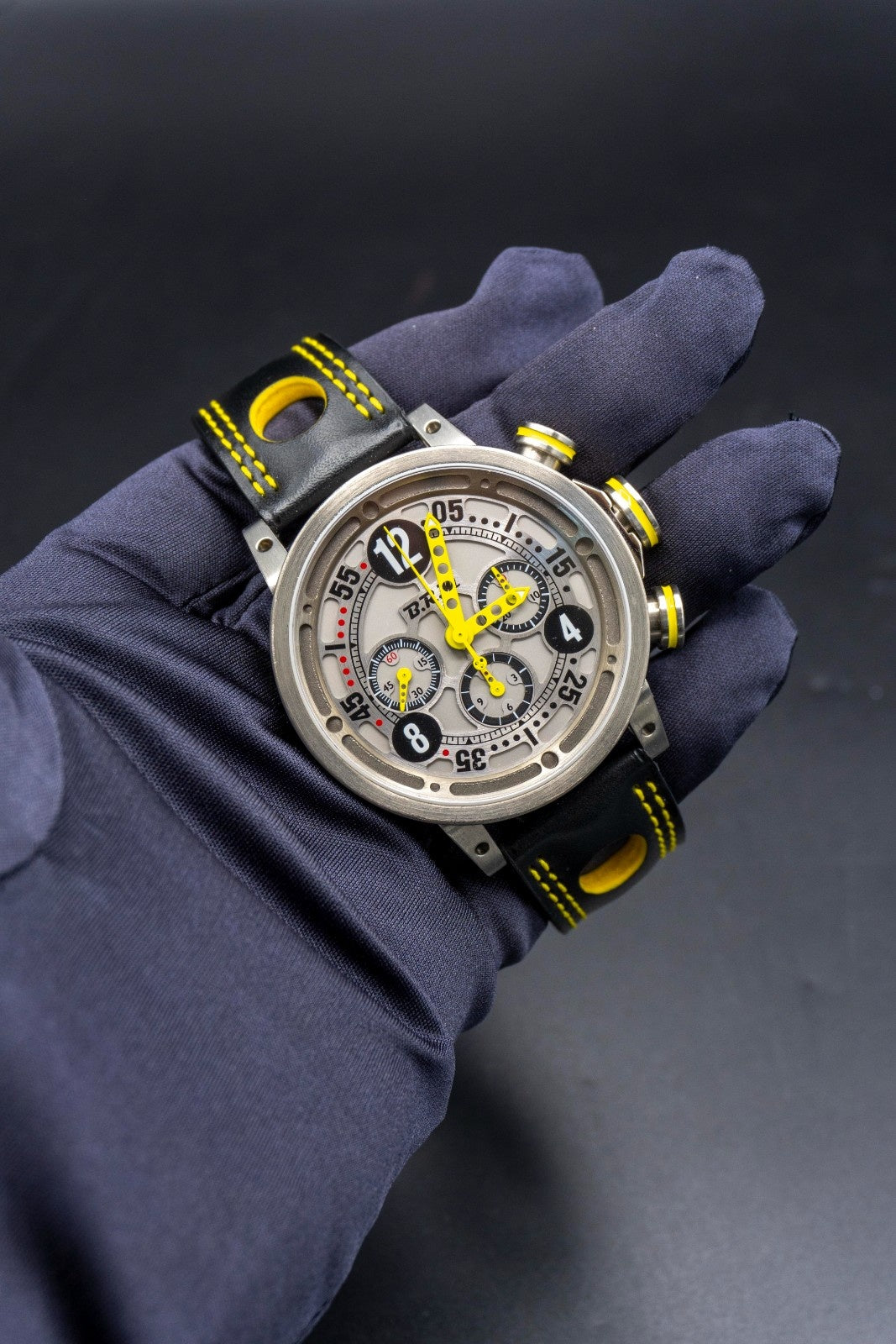 The BRM Chrono Ringmaster Titanium Limited Edition features a sleek silver dial accented with vibrant yellow details set against a black backdrop, offering exceptional legibility and a bold aesthetic. Crafted from lightweight titanium, this timepiece combines durability with comfort, ideal for enthusiasts seeking precision and distinctive design in a limited-production watch. Its expert engineering ensures reliable chronograph functions, making it a refined choice for collectors and aficionados alike.