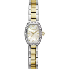 Add a sparkle to your style. 40 brilliant crystals embellish a gold-tone stainless steel case. Silver-white mother-of-pearl dial. Gold-tone accents on stainless steel bracelet with jewelers clasp closure.