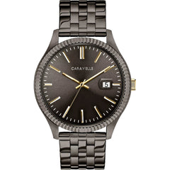 Sleek and streamlined in stainless steel with gunmetal finish, gold-finish crown, grey sun-ray dial, luminous hands, date feature, and double-press fold-over clasp.