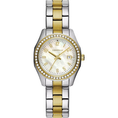 For all-day dazzle and petite perfection, this updated boyfriend design sparkles with 48 brilliant crystals. In stainless steel with two-tone yellow-gold and silver finish, patterned silver-white sunray dial, calendar, and double-press fold-over clasp.