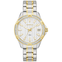 For all-day dazzle, this Aqualuxx luxury sport watch sparkles with 42 brilliant crystals. In stainless steel with two-tone yellow-gold and silver finish, silver-white wave inspired dial texture, calendar, and double-press fold-over clasp. Water resistant to 100 meters.
