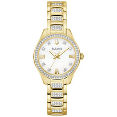 This new addition to the Bulova ladies’ Crystal collection balances a dressy aesthetic with sporty versatility. The gold-tone stainless steel case has a polished bezel fully set with dazzling crystals that complement the dial and bracelet. The opalescent mother-of-pearl dial features gold-tone hands with luminescent fill, polished gold-tone Roman numerals, and hand-set crystal hour markers. The watch is complemented by a gold-tone stainless steel bracelet adorned with crystals, and a deployant push-button closure. Set with 128 crystals, this ladies’ Bulova timepiece expresses radiant beauty.