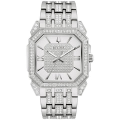 The latest statement timepiece from the dress crystal Octava collection arrives with brilliant style and contemporary appeal. The new, angular-shaped silver-tone stainless steel case surrounds the 3-hand silver-white and pave dial with bold Roman numeral accents and features 300 hand-set crystals positioned on the dial, case, and bracelet to enhance the striking design. The silver-tone bracelet has a deployant buckle with pushers for easy closure. This sophisticated timepiece will take the wearer from day to night with effortless style.