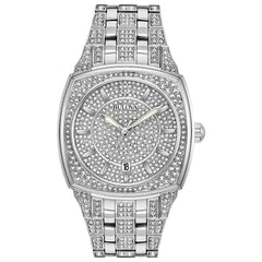 Dress watch opulently embellished with 582 crystals on the cushion-shaped stainless steel case and bracelet, and round pave set three-hand silver white dial with date feature. Curved mineral crystal, deployant closure, quartz movement, and water resistance to 30 meters.