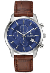 Timeless design and modern functionality define this new 6-hand Bulova men’s chronograph from the Sutton Collection. A refined silver-tone stainless steel case with a blend of brushing and polishing features classically styled chronograph pushers and a domed mineral crystal. The attractive blue dial features applied hour markers against a circular grooved track, luminescent hour and minute hands, and a date display. The chronograph can time events up to 12 hours to the nearest second. Perfectly paired with a brown crocodile grain leather strap with a matching silver-tone stainless steel deployant clasp. This new Bulova men’s timepiece from the Sutton Collection will have you looking your best for every occasion.