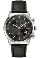 Timeless design and modern functionality define this new 6-hand Bulova men’s chronograph from the Sutton Collection. A sophisticated silver-tone stainless steel case with a blend of brushing and polishing features classically styled chronograph pushers and a domed mineral crystal. An elegant black dial features applied hour markers against a circular grooved track, luminescent hour and minute hands, and a date display. The chronograph can time events up to 12 hours to the nearest second. Perfectly paired with a black crocodile grain leather strap with a matching silver-tone stainless steel deployant clasp. This new Bulova men’s timepiece from the Sutton Collection will have you looking your best for every occasion.