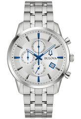 Timeless design and modern functionality define this new 6-hand Bulova men’s chronograph from the Sutton Collection. A silver-tone stainless steel case with a blend of brushing and polishing offers a sophisticated aesthetic and features classically styled chronograph pushers and a domed mineral crystal. A sleek silver-tone dial features applied black and blue hour markers against a circular grooved track, luminescent blue hour and minute hands, and a date display. The chronograph can time events up to 12 hours to the nearest second. For a seamlessly elegant look, the watch is paired with a silver-tone stainless steel multilink bracelet with a deployant closure. Elevate your wardrobe with design that never goes out of style with this new Bulova men’s chronograph timepiece from the Sutton Collection.