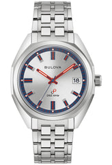 Straight from the 1970s comes this limited edition Bulova 1973 Jet Star, an iconic model from the brands impressive history, now equipped with an equally impressive movement. Borrowing from its historic forebear, the stainless steel case features a striking angular design with broad facets and a domed sapphire crystal. The vivid silver-tone sunburst dial is accented by a blue and red chapter ring, applied blue and red hour markers, and bold red hands. Luminescent plots at each hour and fill in the hands allow for exceptional legibility in every environment, while a date display sits perfectly at 3 o’clock. The new Jet Star is powered by Bulova’s Precisionist movement, a revolutionary 8-jewel quartz mechanism vibrating at a remarkable 262kHz, accurate to 5 seconds per month with increased resistance to temperature changes, and with a sweeping seconds hand. Complementing the stainless steel case is a matching bracelet with a deployant clasp closure and latched spring bars for easy release. This limited edition model also includes a richly colored blue leather strap and is presented in special packaging with a numbered limited edition card. Strut your stuff in legendary style with the high-flying limited edition Bulova 1973 Jet Star, a legendary design recreated for the modern connoisseur.