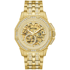 From the Crystal Collection, this bold Octava timepiece, in gold-tone stainless steel, gets a luxurious update with an open aperture 21-jewel automatic movement in a signature Bulova design embellished with 251 crystals on the bezel, bracelet and dial. This timepiece also has a double-press deployant buckle closure and is water resistant to 30 meters. You’re sure to make an unforgettable impression with this bold men’s watch on your wrist.