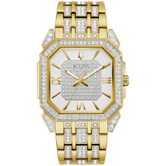The latest Octava timepiece from the men’s dress classic Crystal collection arrives with brilliant style and contemporary appeal. The new, angular-shaped gold- and silver-tone stainless steel case surrounds the 3-hand silver-white and pave dial with bold Roman numeral accents and features 300 hand-set crystals positioned on the dial, case, and bracelet to enhance the striking design. The gold- and silver-tone bracelet has a deployant buckle with pushers for easy closure. This sophisticated timepiece will take the wearer from day to night with effortless style.