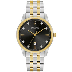 Two-tone stainless steel case and bracelet with a black dial featuring eight diamonds set on the dial and gold-tone hands, and a calendar window at the 6 o’clock position. Domed mineral crystal. Deployant buckle.