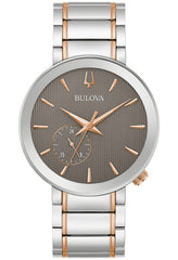 This new Bulova men’s timepiece adds to the Latin GRAMMY® Collection and continues the brand’s celebration of the awards show and the remarkable artists that make it possible. An edge-to-edge, curved metalized sapphire crystal creates an exceptionally modern 42mm case, which features silver-tone stainless steel and a rose gold-tone crown. The textured dial is accented with rose gold-tone hands and markers and a 24-hour sub-dial. On the back of the watch, the screw-back case is stamped with Latin GRAMMY® logo. The watch is paired perfectly with a matching two-tone bracelet with a deployant clasp. Bring the spirit of the Latin GRAMMY® awards and its incredible artists with this new Bulova men’s timepiece.