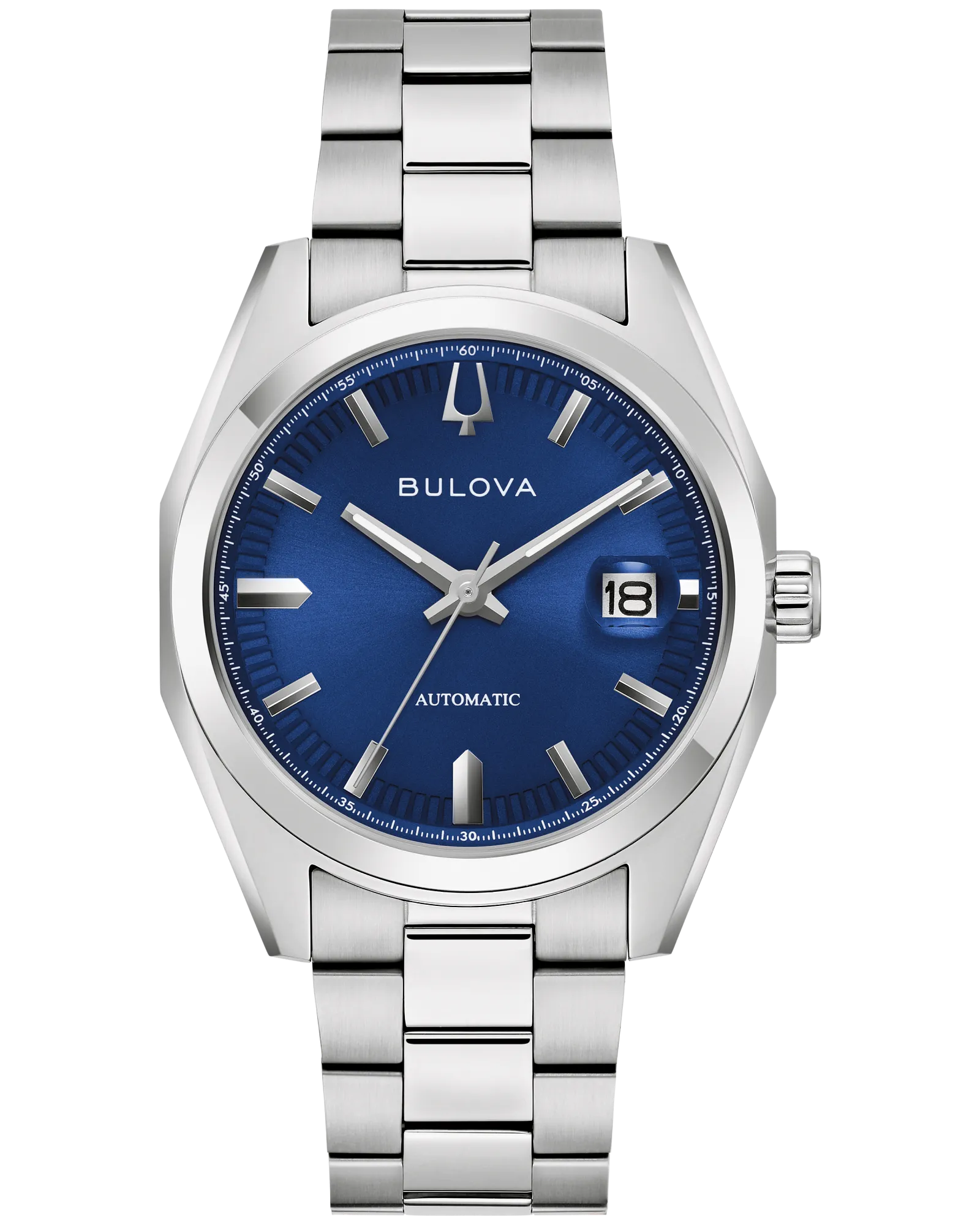 The Bulova men’s Surveyor is defined by exceptional quality and sophisticated aesthetics. The silver-tone stainless steel case features sculpted edges and faceting which provide an effortless wear on the wrist, with polished and brushed finishing, a flat sapphire crystal, and a matching quick-release 3-link stainless steel bracelet with a push-button deployant clasp. The vibrant blue dial has a sunburst finish and features silver-tone accents, hands with luminescent fill, debossed minute markers, and a magnified date display. The watch is powered by an automatic movement with 21-jewels and a 42-hour power reserve, which can be seen in full through a mineral crystal exhibition window in the caseback. For those with a discerning eye for refined luxury, this Bulova men’s timepiece is the obvious choice.