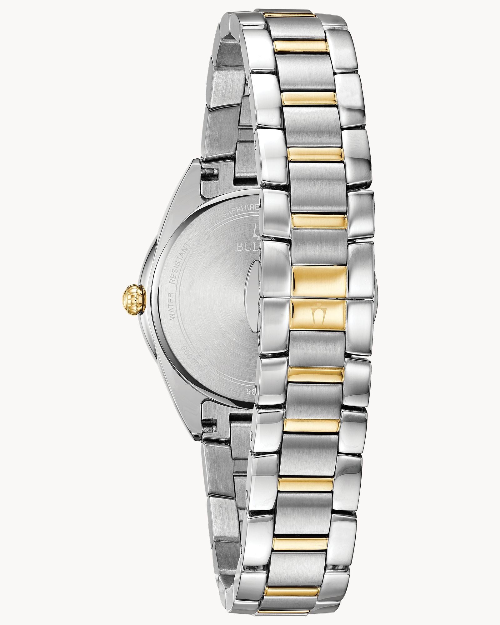 Slim stainless steel and gold-tone case, lustrous white mother-of-pearl three-hand dial with 8 diamonds, domed sapphire crystal, stainless steel and gold-tone bracelet with push-button deployant clasp, quartz movement, and water resistance to 30 meters.