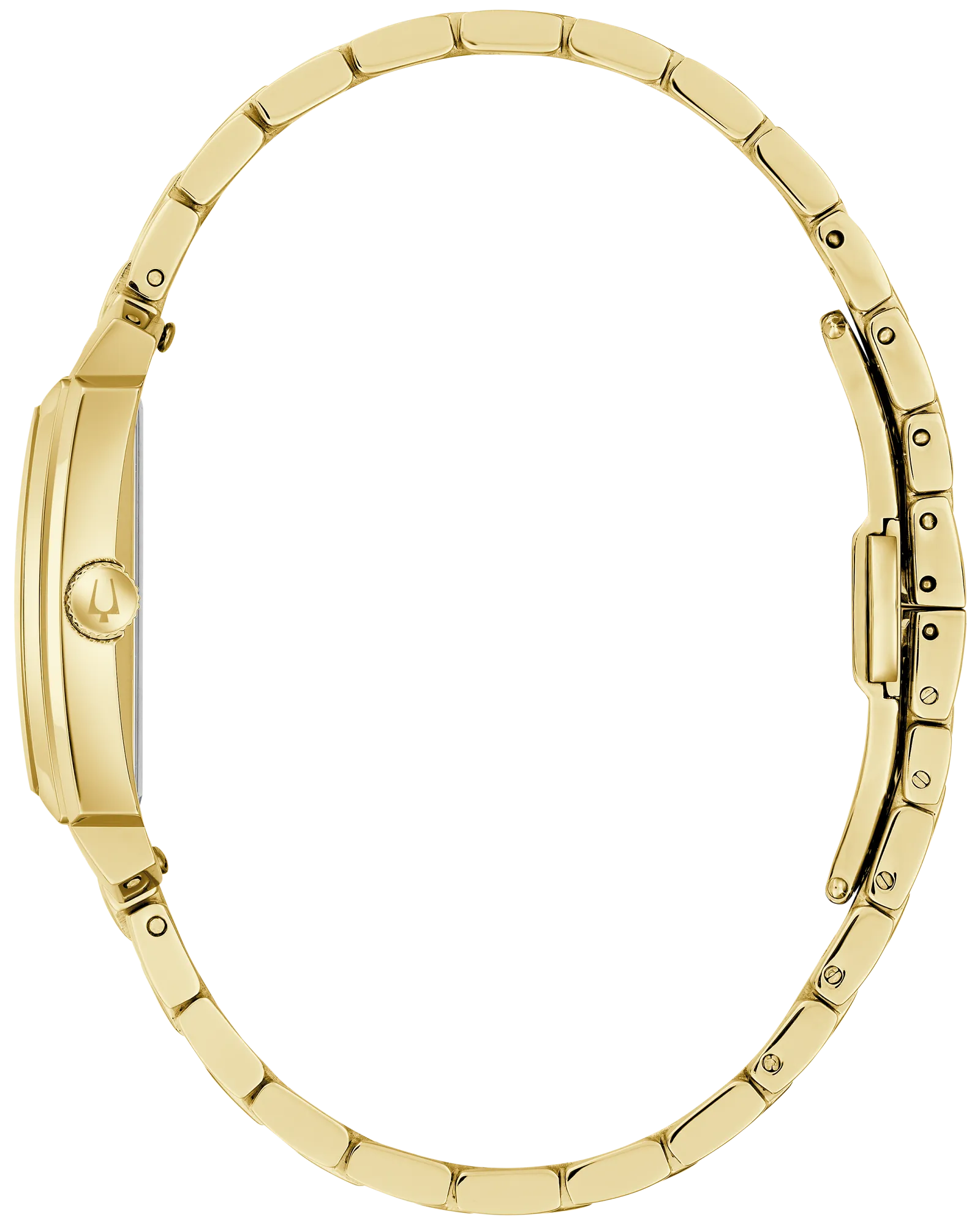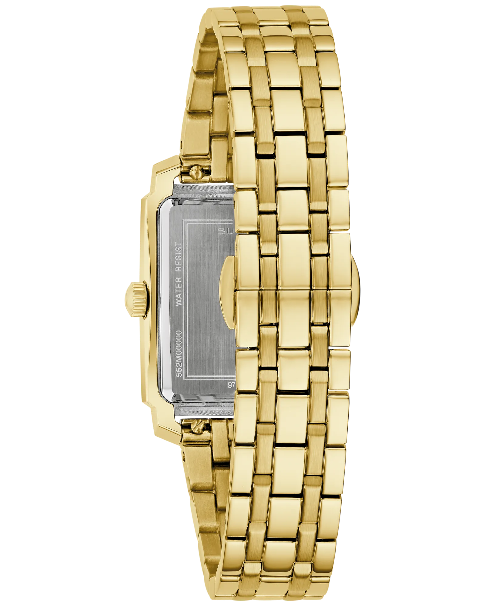 Embrace a refined elegance with this impressive Bulova women’s timepiece from the Sutton collection. Distinguished by a gold-tone stainless steel rectangular case, the watch features a mineral crystal and a finishing that dazzles in the light. The brilliant white enamel dial is accented with applied gold-tone numerals and hands for a look of true sophistication. A matching five-link gold-tone stainless steel bracelet features a deployant closure with pushers for a perfect fit and latched spring bars for easy release. Experience an elevated sense of luxury with this Bulova ladies’ timepiece for the woman with an exceptional sense of style.