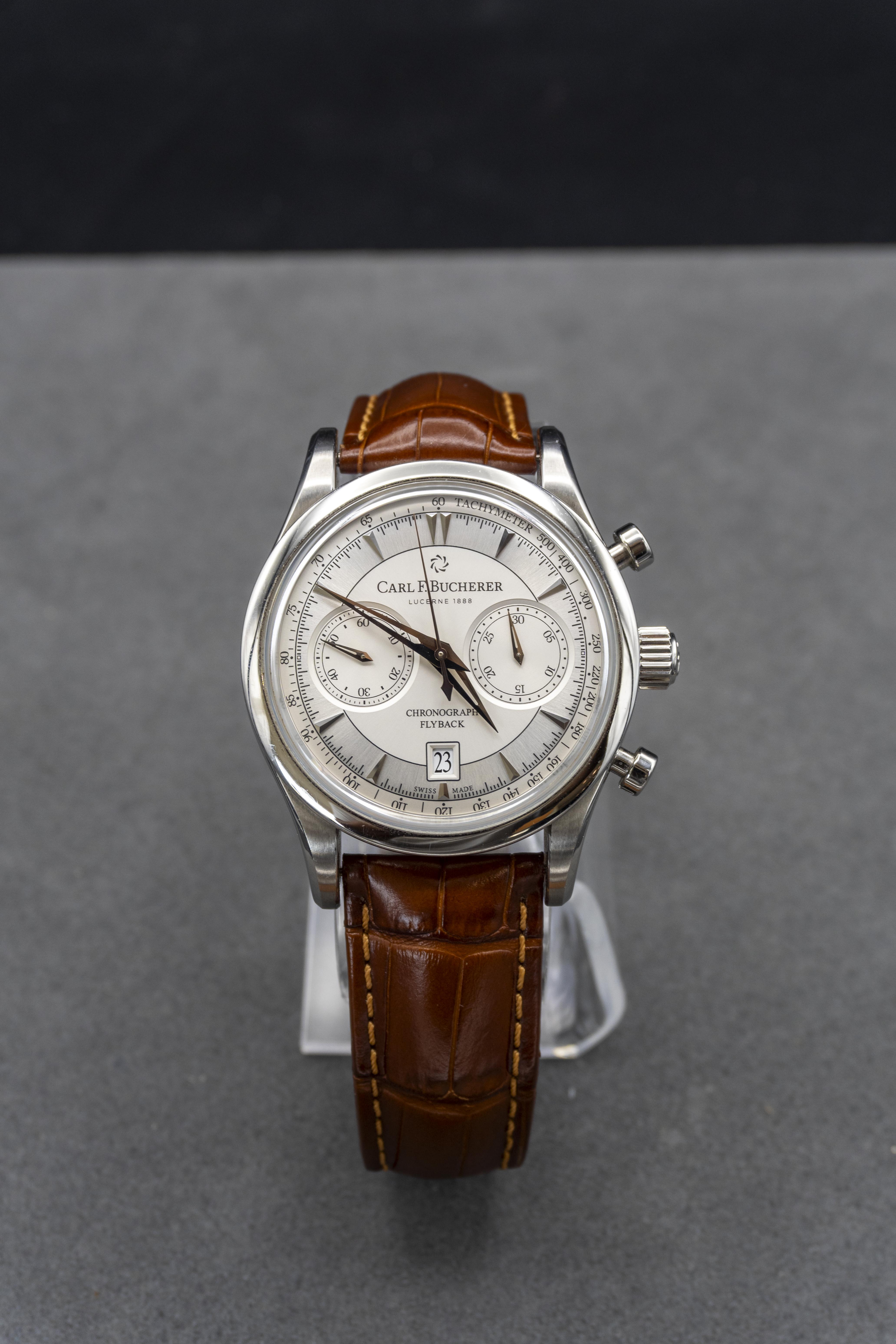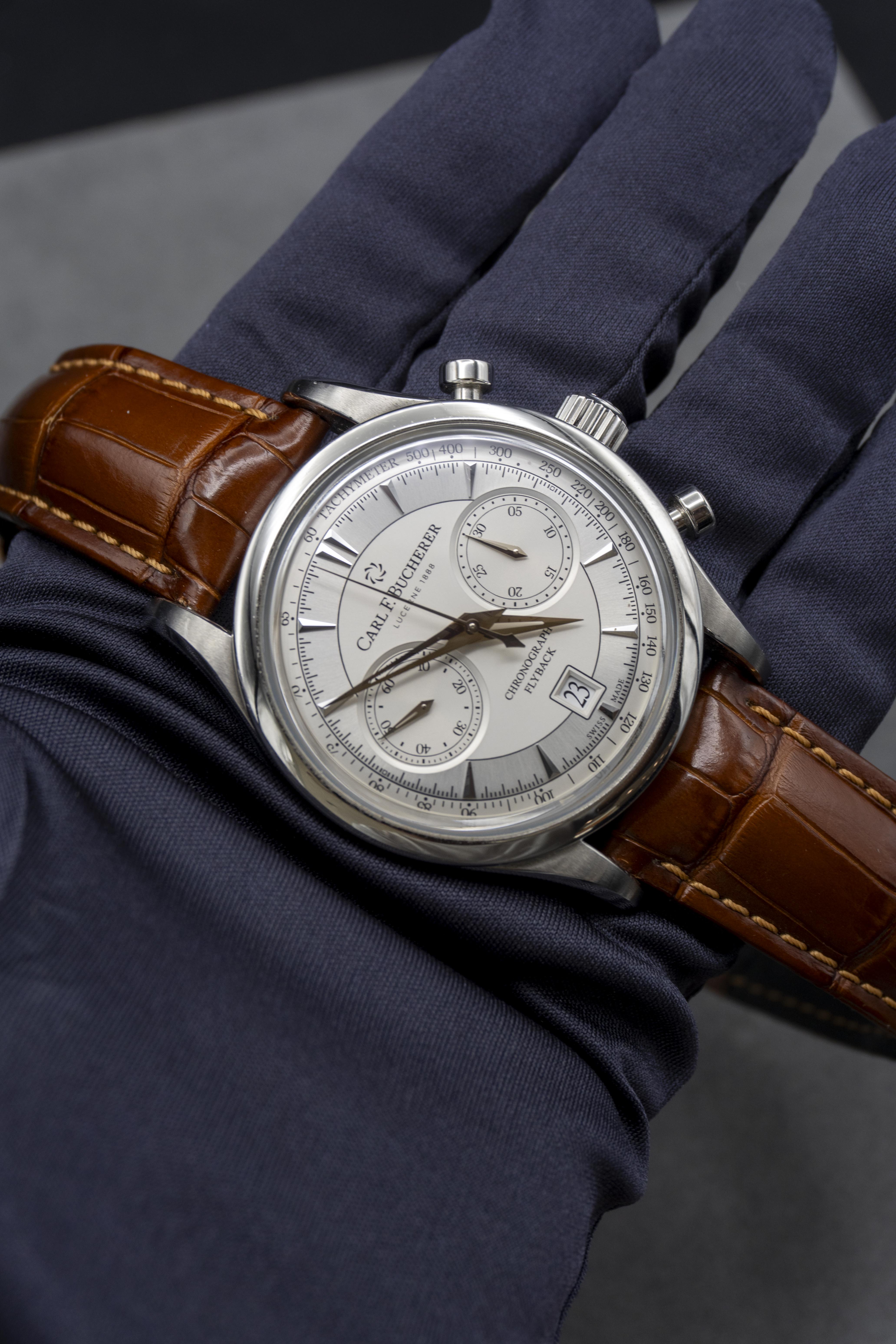 29 JewelsPower reserve 42 hoursWater resistance: to 3 bar (30 m)Chronograph, Flyback, Date, Hour, Tachymeter scale, Minute, Small secondsRose-gold-plated wedge handsSilver dial with rhodium-plated wedge index marks