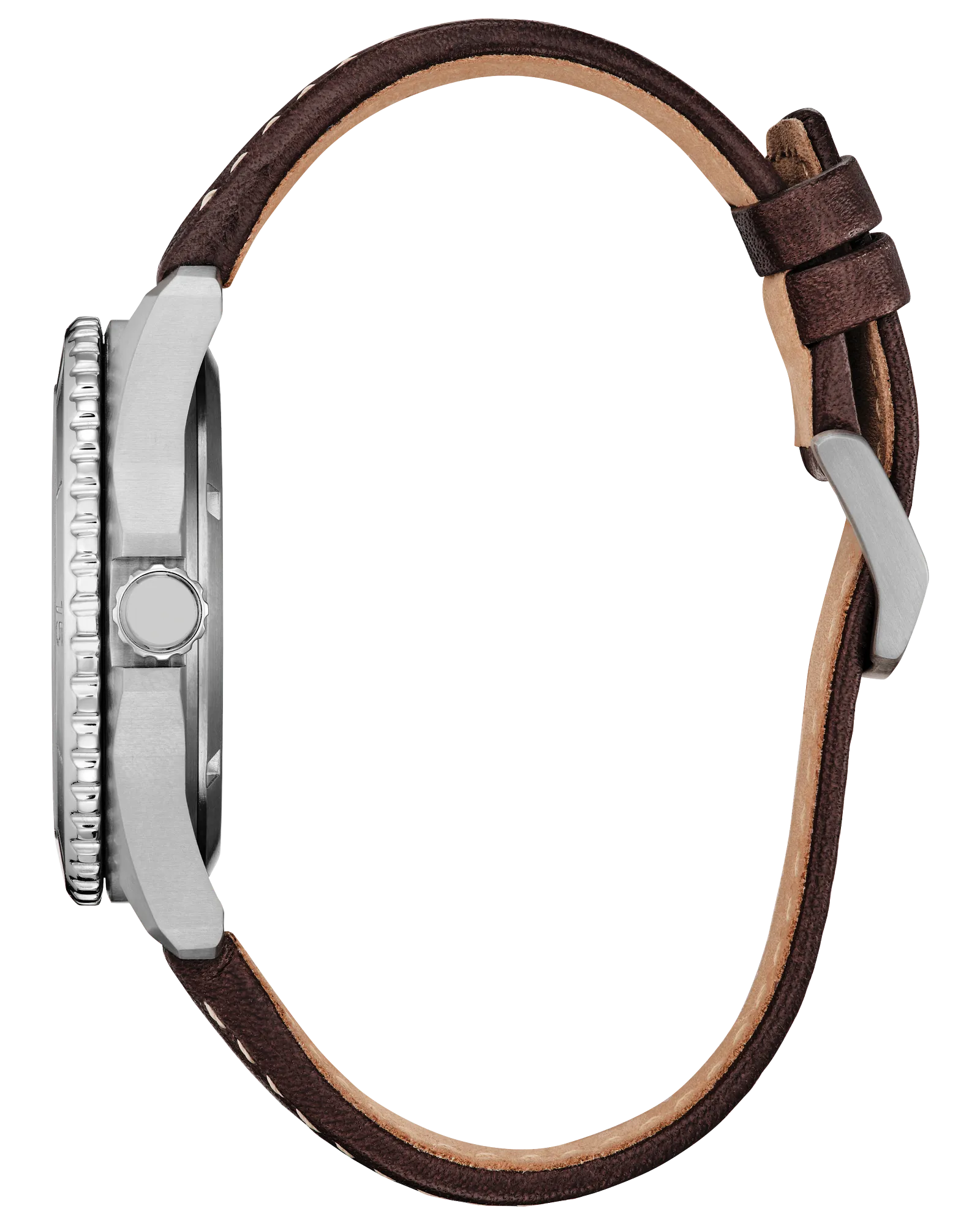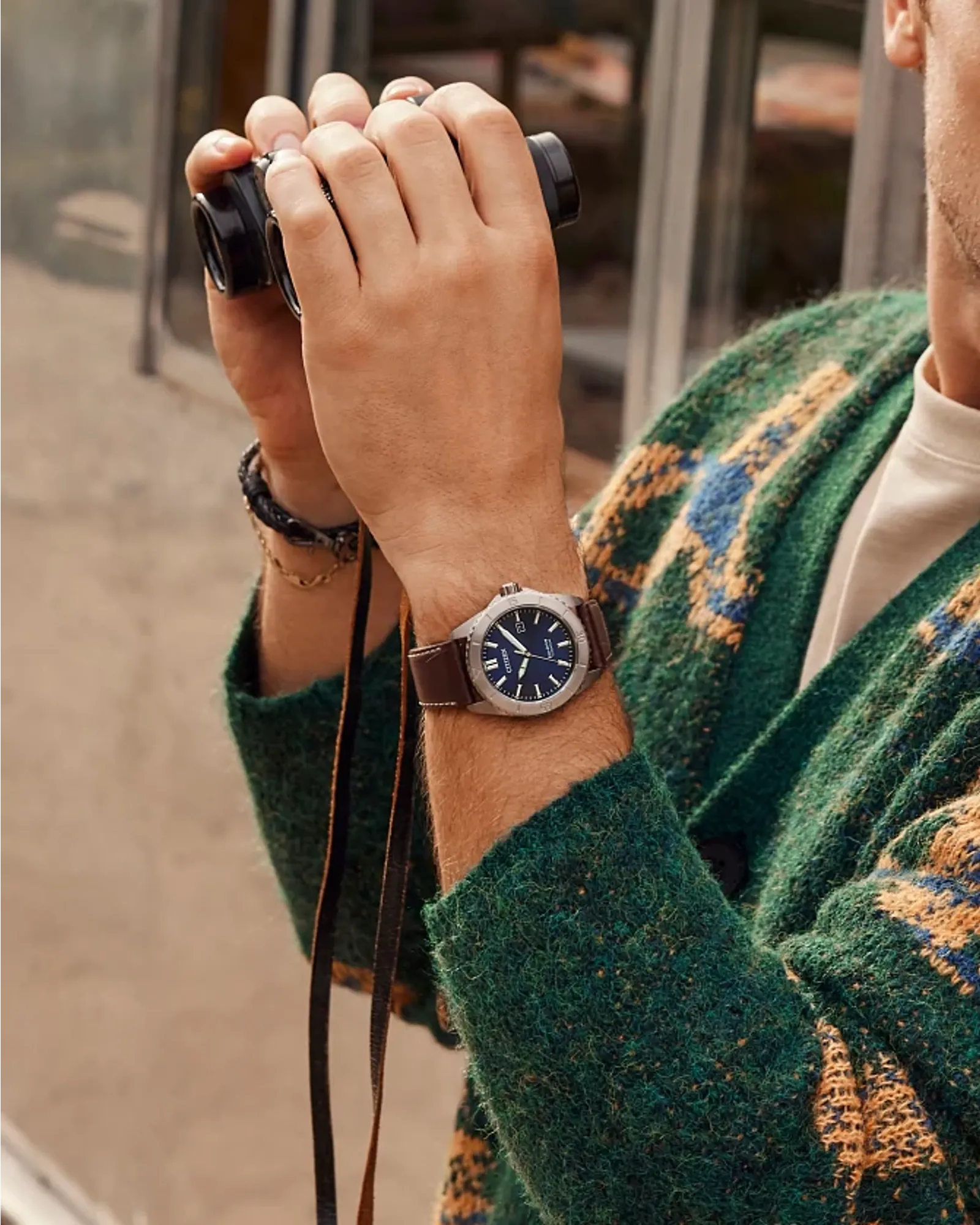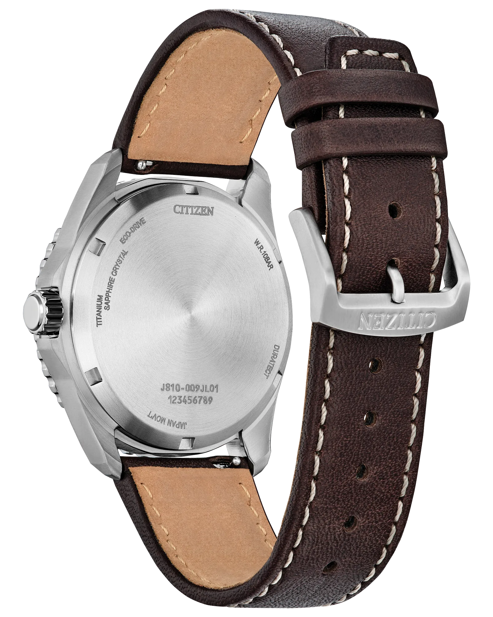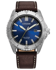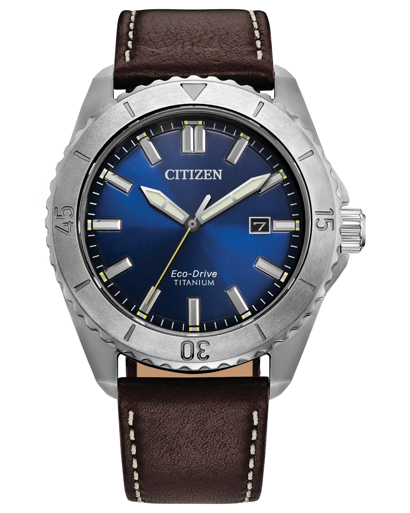 Take action and show your inner drive with the sporty styling of the Brycen, the latest addition to the Weekender collection. Featuring a silver-tone Super Titanium™ case with a brushed finish, the 41mm timepiece is durable in form and function with its matching bi-directional rotating bezel and triple-link bracelet. On the sunray blue dial, highly legible timekeeping elements are at work, with a yellow seconds counter providing a pop of color and a 3 o'clock date window providing daily utility. Featuring our proprietary Eco-Drive technology – powered by light, any light. Never needs a battery. Caliber number J810.