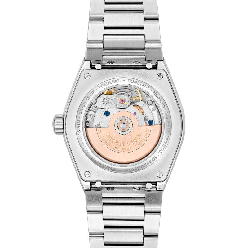 The combination of steel, diamond and wonderfully pure rubber range in colour from pale grey to the shiniest diamond, via infinite nuances depending on the reflections adorning the piece. In sunlight or moonlight, from midday to midnight, the Highlife Ladies Automatic Sparkling moves around the sun and the moon dial with grace and modernity, beating to the rhythm of those who live for the moment.