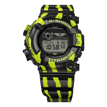 Bright, bold, fearless! The Frogman diver’s watch takes on the tiny, but three-striped poison dart frog.* This Frogman pays homage to the three-striped poison dart frog found in South American rainforests, expressing the frog’s toughness and vivid warning coloration with a bold green and black design. Bold vertical stripes in fluorescent green stand out against a black base for a striking, rugged look that showcases the dart frog’s intensity. The band and bezel are finished with a spray coating to evoke the texture of the frog’s skin. And the case back is, of course, engraved with the iconic diving frog character featured on every Frogman timepiece. Tough Solar eliminates the need for regular battery replacement, keeping even the most power-hungry functions running smoothly on even small amounts of indoor light. Key resin components used in the bezel and band are made with bio-based resin. * The three-striped poison dart frog takes its name from the fact that its venom was extracted and applied to blow darts used for hunting.