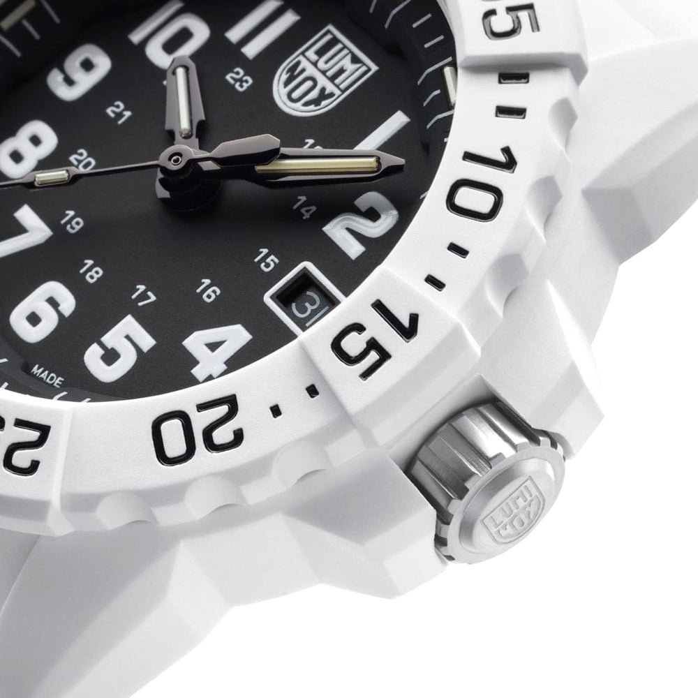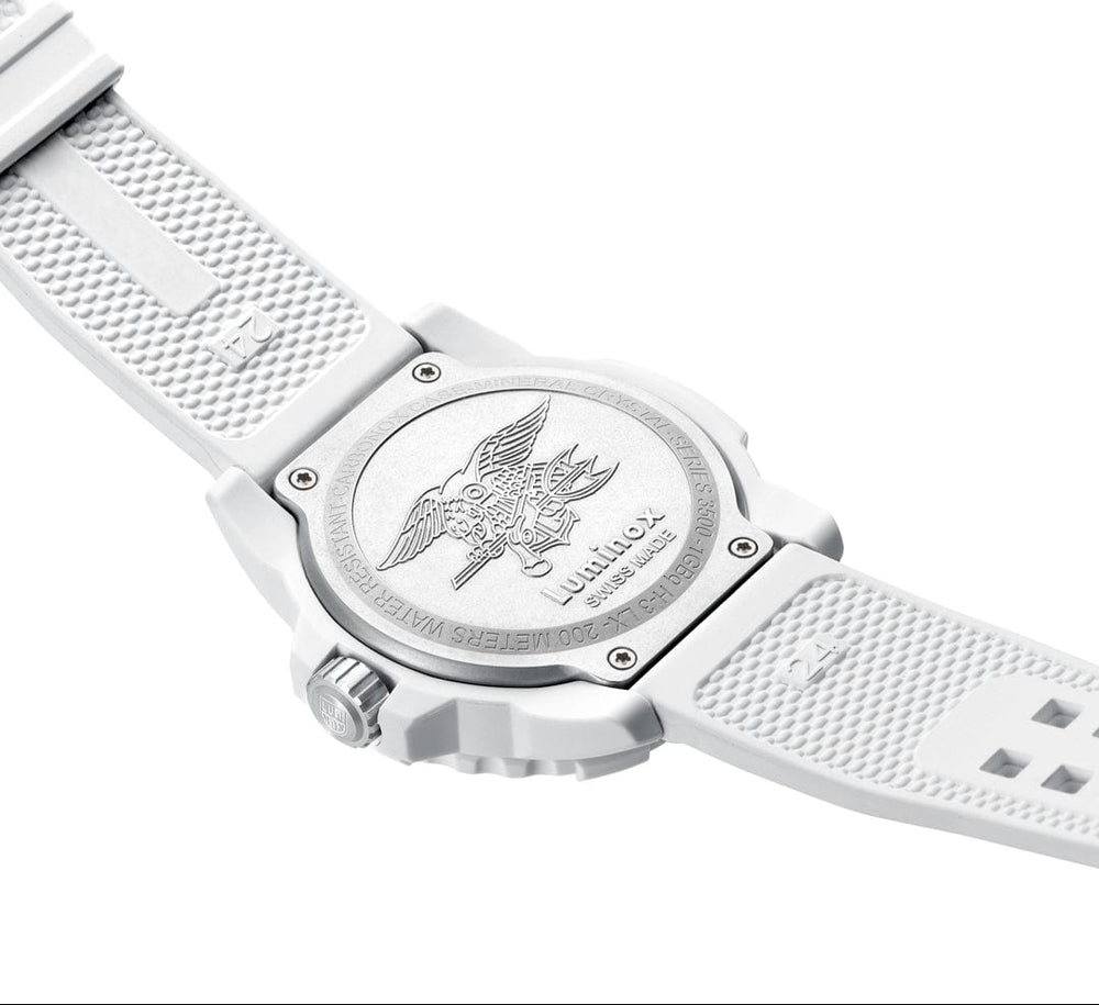 This Arctic Edition, a striking white timepiece with a contrasting black dial, maintains the rugged reliability of the iconic Navy SEAL 3500 Series. The bold timepiece introduces a lightweight white fiberglass 45mm case and uni-directional bezel, designed for durability while enhancing stealth in arctic environments. The black dial with white numerals ensures maximum readability in daylight, while Luminox Light Technology (LLT) provides constant visibility in complete darkness for up to 25 years, critical for missions in low-contrast environments. A white rubber strap offers a secure, comfortable fit, while the unidirectional rotating bezel allows precise tracking of elapsed time, making it an essential tool for military personnel and Arctic explorers alike. Whether navigating icy terrains or facing tactical challenges, the Navy SEAL 3500 – Arctic Edition is engineered for peak performance in the most demanding conditions.