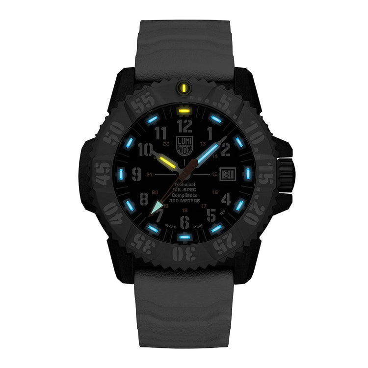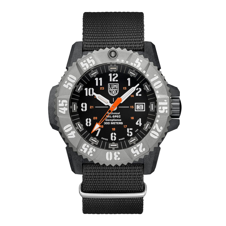 Mil-Spec (short for Military Specification) refers to the military standard from the U.S. Department of Defense. The Luminox MIL-SPEC 3359 with a lightweight yet ultra-durable CARBONOX™+ 46mm case, Grade 2 Titanium bezel, and 300-meter water resistance, meets these rigorous technical standards and thrives in the world’s toughest conditions. Inside, the Swiss-made ETA F06.412 quartz movement with HeavyDrive and PreciDrive ensures precision and reliability, even under extreme impact or temperature change. The bold white strap and bezel markings offer an arctic-ready aesthetic, while the large orange second hand with SuperLumi-Nova coated arrow-tip, plus Luminox Light Technology, ensure unmatched visibility in all light conditions. Delivered as a set with an additional black webbing strap, this battle-tested timepiece offers both performance and versatility. Built to the technical compliance of MIL-PRF-46374G Type III Class 1, the XL.3359.SET is trusted by professionals and built for those who never back down.