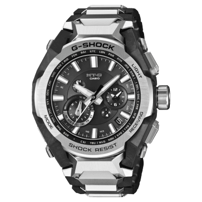 Discover innovative form and structural beauty — MT-G timepieces that combine metal materials with the resin used in the first G-SHOCK models. The MTGB4000D features an updated Dual Core Guard structure with a frame design integrating carbon fiber and stainless steel, which was developed with the aid of artificial intelligence trained with big data on impact resistance. A seamless collaboration between AI capabilities and human developers, this timepiece creatively integrates materials, structure, and design into an organic whole of functional beauty. Base designs created by human designers were analyzed and simulated by AI and then further refined by the human hand to render a unique form that organically synthesizes functionality and beauty. The intricate, dimensional form of the frame is cut out from a base material of laminated carbon and glass fiber sheets, creating a beautifully layered pattern. The stainless-steel components of the bezel, featuring a dual-layer design of inner and outer bezels, are polished with separate hairline and mirror finishes for a sophisticated textural look. The band also features a layered composite construction that integrates stainless steel and carbon fiber-reinforced resin. Combining the ruggedness of metal and lightness of resin, the band has a solid, substantial feel, while ensuring a comfortable fit. The watch employs the Triple G Resist structure to withstand shock, centrifugal force, and vibration. The case is also protected by the dimensional form of the case back, which is created using metal injection molding (MIM), a method of processing metal in which fine metal powder is injected into molds. Meticulous attention paid to every detail is apparent down to the sapphire crystal, which delivers high transparency. The dial incorporates delicate components featuring intricate designs achieved with fine processing technology from Yamagata Casio. This innovative, tough style delivers full-on functionality, as well. Download the CASIO WATCHES app to pair with your smartphone via Bluetooth®. With Multiband 6, Tough Solar charging system, and high-brightness LED light, these timepieces keep you at peak performance, whatever your adventures may bring.