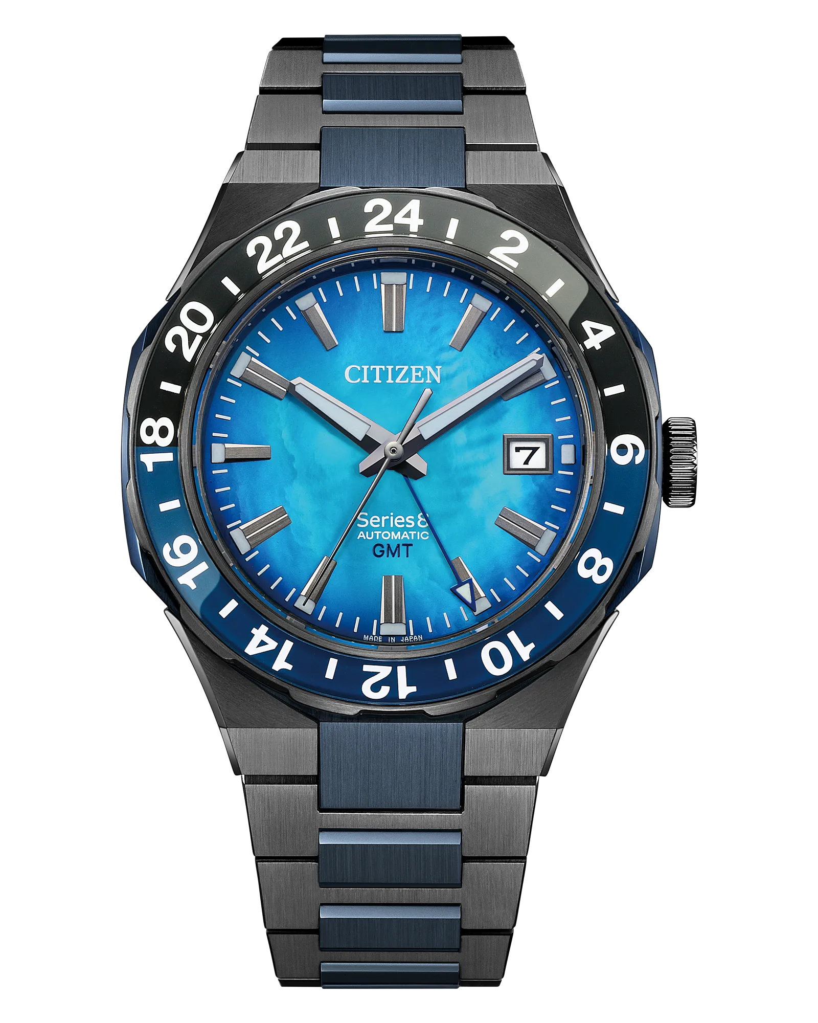 Functional and practical, modern and sporty –– the new Citizen Series8 880 GMT is the perfect companion for daily wear to spirited travel, and everything in between. Featuring a black and blue two-tone stainless steel case with a bi-directional bezel, the 41mm model highlights the best of Citizen's creative watchmaking and finishing techniques.