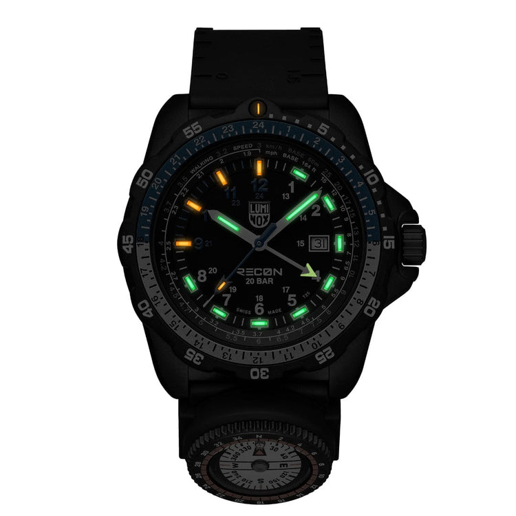 Built in collaboration with tactical specialist Andrea Micheli, this rugged 46 mm timepiece is engineered for precision navigation. The 8833 is constructed from a lightweight yet ultra-durable CARBONOX™ case and a unidirectional rotating bezel with a two-tone aluminium ring insert. The striking blue top of the ring insert, the indexes 9-12, and the second hand create an interesting colour highlight. The dial is protected by a sapphire crystal with an anti-reflective coating, and the watch is water-resistant up to 200 meters. Powered by a Swiss quartz GMT movement, the 8830 series enables you to track two time zones simultaneously, making it ideal for global missions or international travel. The black rubber strap includes integrated map scales and ruler markings, plus a detachable compass, transforming the watch into a complete navigation instrument. Thanks to Luminox Light Technology, the XL.8833 remains visible in all light conditions with a constant glow lasting up to 25 years.