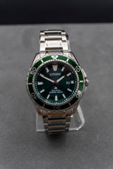 Proof that a dive watch can be fun & functional with the CITIZEN ISO-compliant Promaster Diver. With Eco-Drive technology, it is powered by light and never needs a battery, so you'll never need to open your caseback or compromise your dive again. Featured in stainless steel with green aluminum bezel and matching green dial, one-way rotating elapsed time and water resistant to 200 metres. Calibre E168.