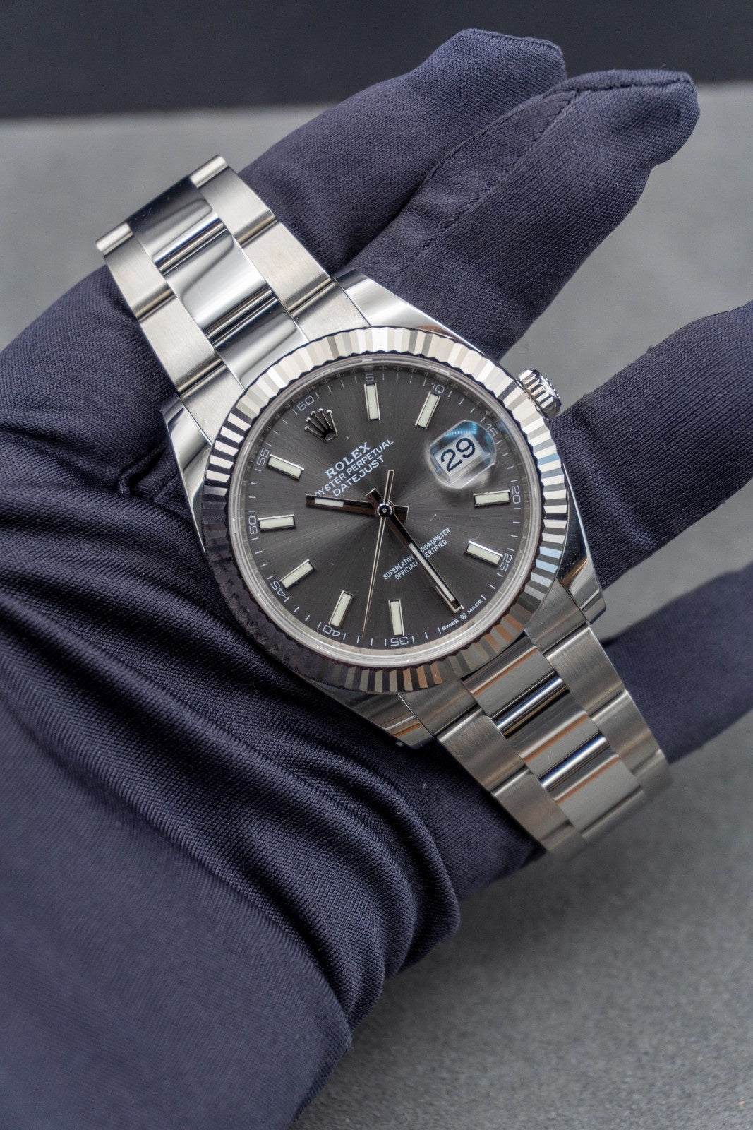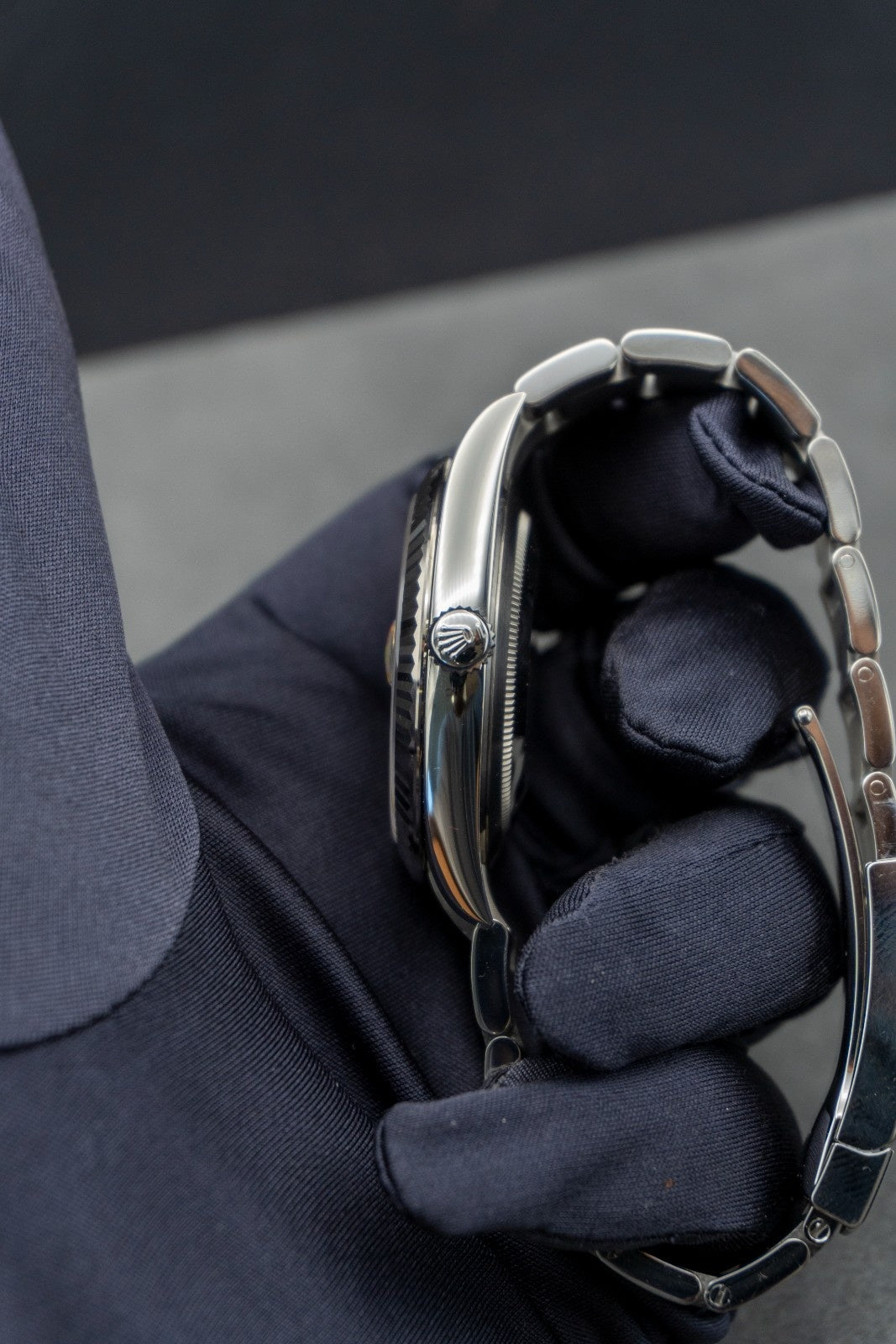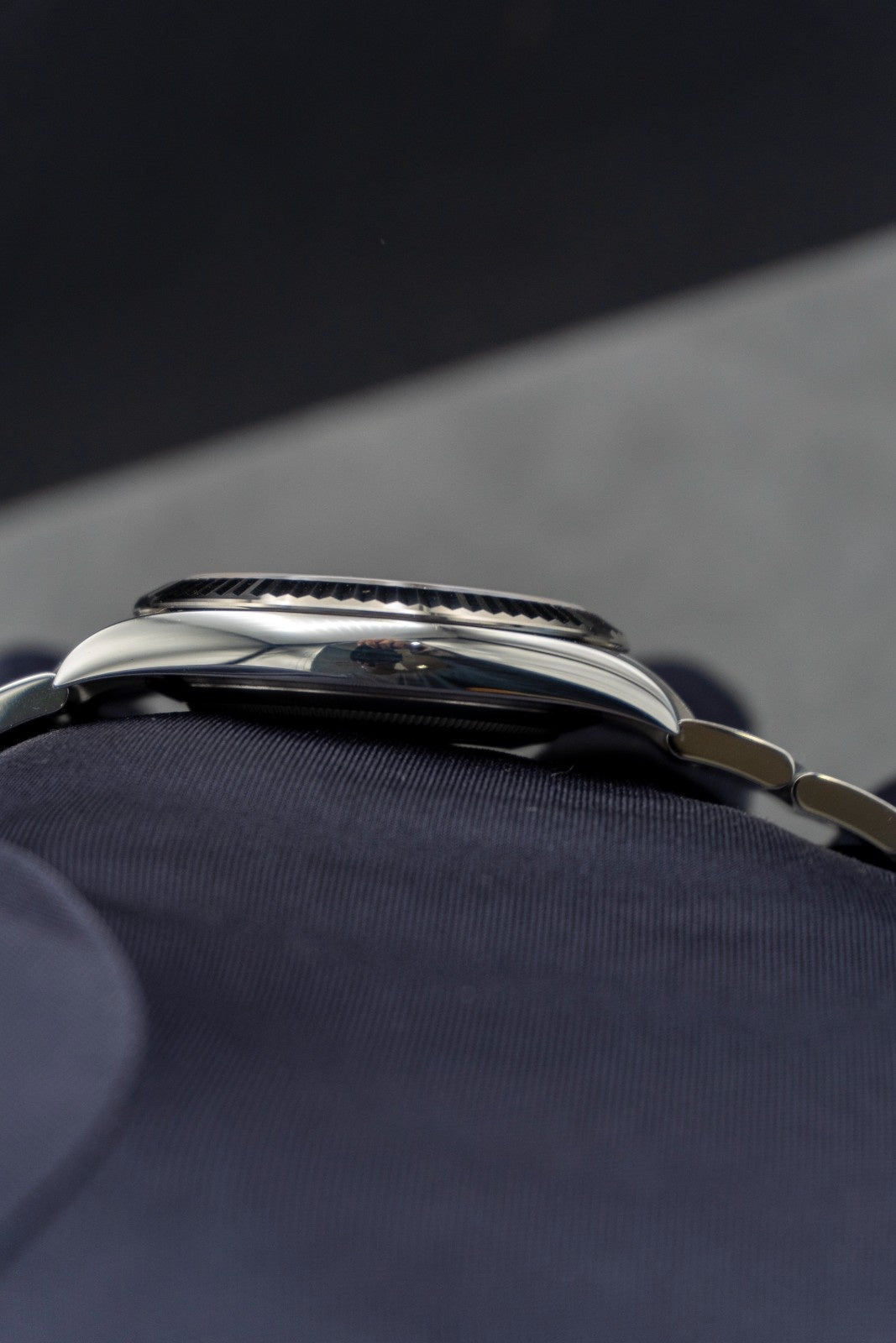 The sunray finish creates delicate light reflections on many dials in the Oyster Perpetual collection. It is obtained using masterful brushing techniques that create grooves running outwards from the centre of the dial. Light is diffused consistently along each engraving, creating a characteristic subtle glow that moves depending on the position of the wrist. Once the sunray finish has been completed, the dial colour is applied using Physical Vapour Deposition or electroplating. A light coat of varnish gives the dial its final look. The Rolex fluted bezel is a mark of distinction. Originally, the fluting of the Oyster bezel had a functional purpose: it served to screw the bezel onto the case helping to ensure the waterproofness of the watch. It was therefore identical to the fluting on the case back, which was also screwed onto the case for waterproofness, using specific Rolex tools. Over time, the fluting became an aesthetic element, a genuine Rolex signature feature.