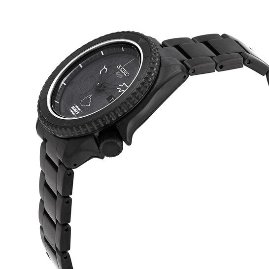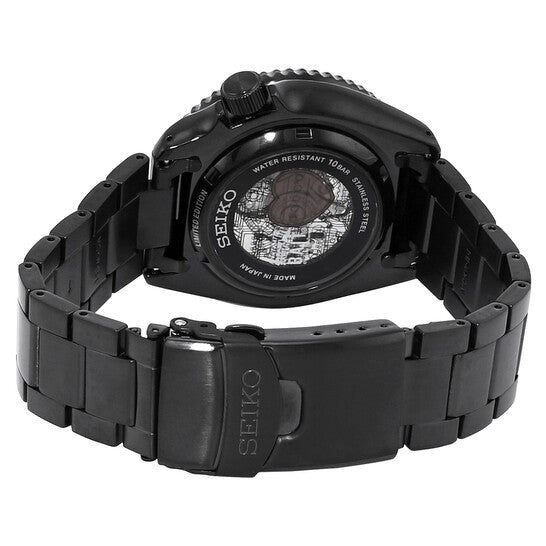 Black stainless steel case and bracelet. Uni-directional rotating black stainless steel bezel. Black dial with black hands and index hour markers. Dial Type: Analog. Day of the week and date display at the 3 o'clock position. Seiko Caliber 4R36 Automatic movement, containing 24 Jewels, bitting at 21600 vph, and has a power reserve of approximately 41 hours. Transparent see through case back. Round case shape, case size: 42.5 mm. Fold over clasp with a safety release. Water resistant at 100 meters / 330 feet. Functions: date, day, hour, minute, second. Additional Info: "bait" l.e. 2000 units. Seiko 5 Series.
