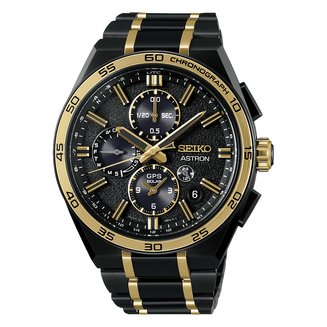 This new GPS Solar Dual-Time Chronograph celebrates Astron's spirit of innovation. Symbolizing success and prosperity, gold-colored accents grace every part of the watch, from the dial and bracelet to the case.
