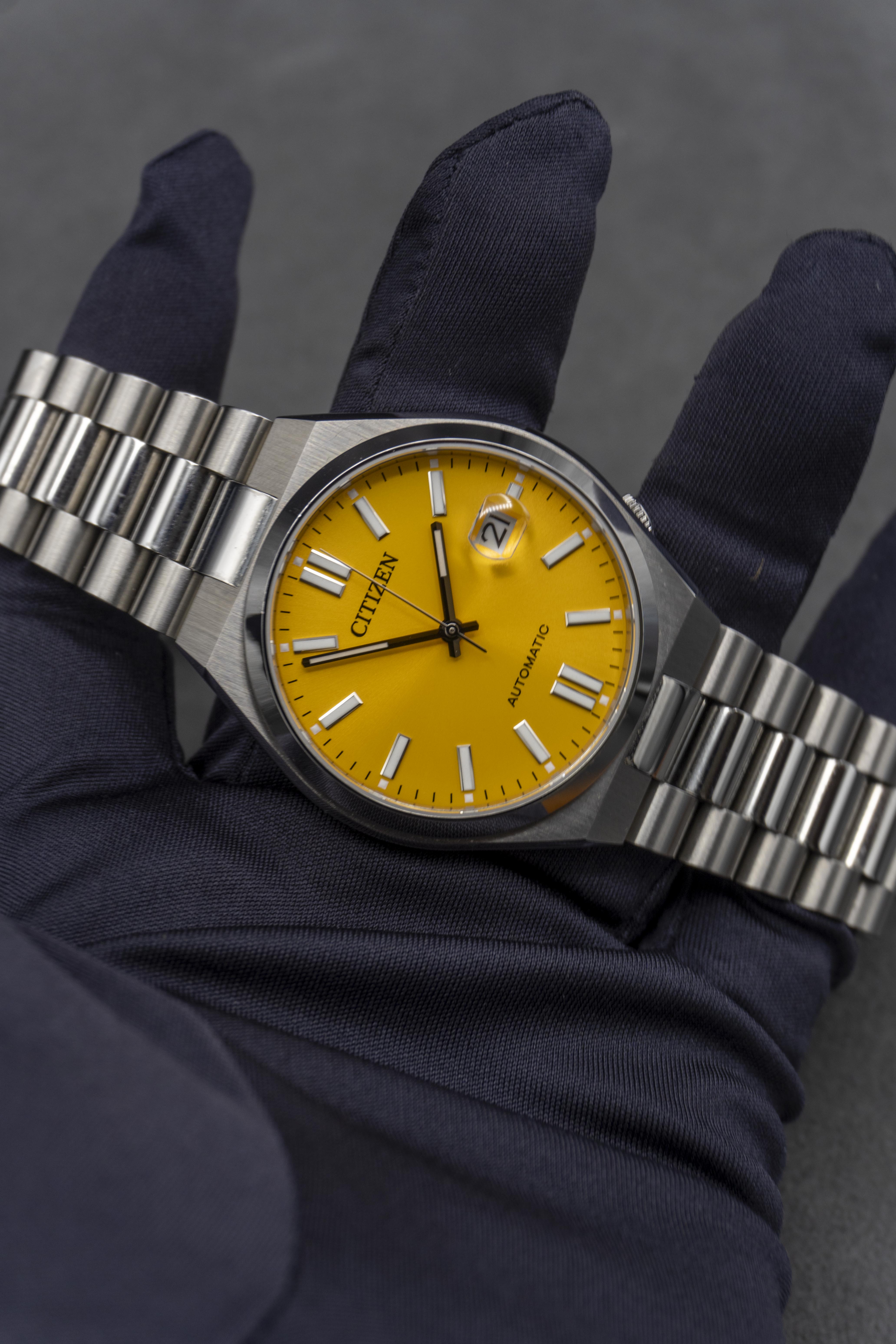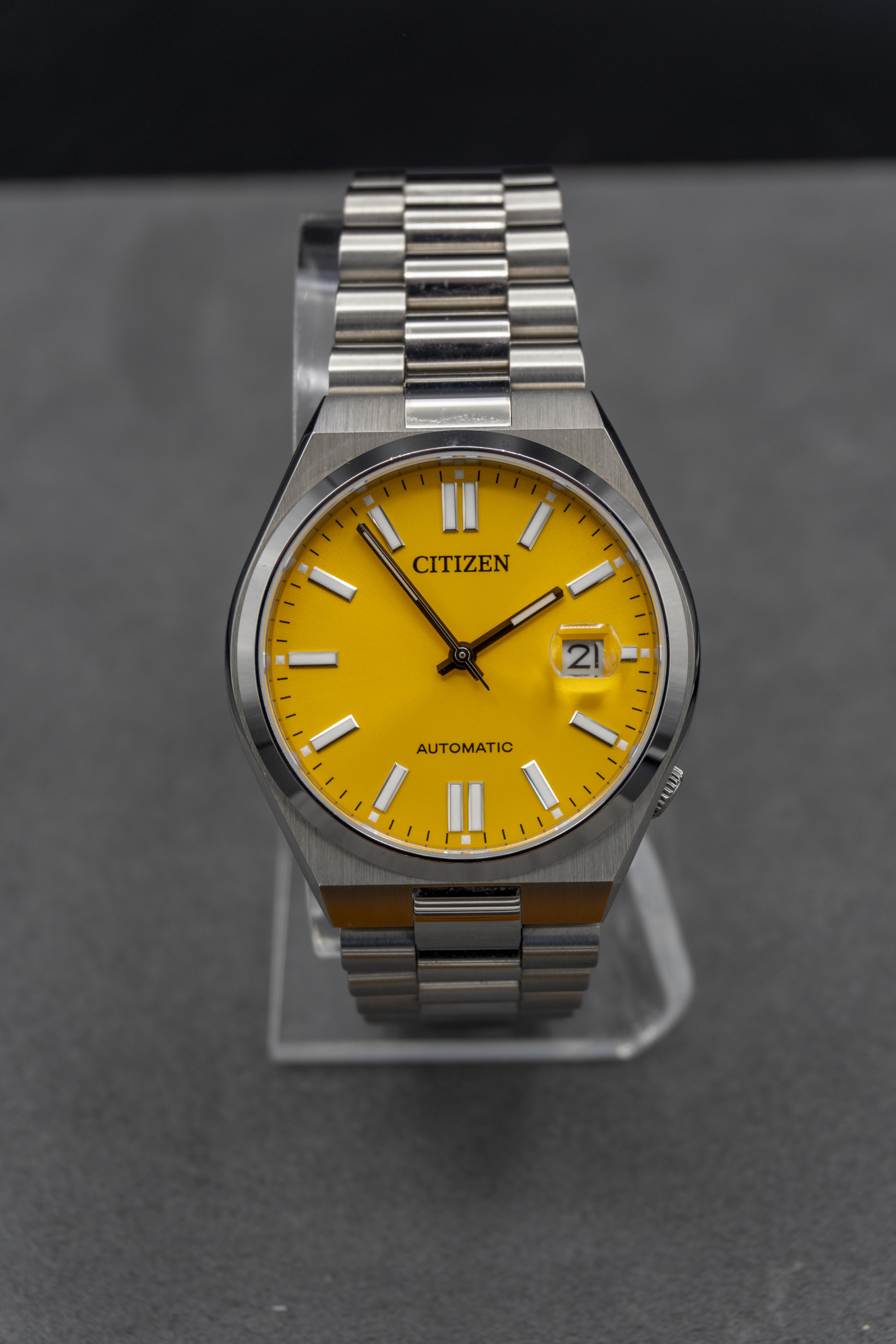 The TSUYOSA Automatic, from the NJ015 series, brings ultramodern sports styling right to your wrist. Executed in a versatile 40mm footprint, the sophisticated design of the watch makes a strong impression via a silver-tone stainless steel case and a seamlessly integrated, matching bracelet. Underneath an anti-reflective sapphire crystal, the sporty timepiece makes use of a sunray yellow dial, with a 3 o’clock date window and contrasting silver-tone details adding to its classic aesthetic. Powered by an automatic movement and offering up to 50 meters of water resistance, the refined timepiece is a daily wearing choice ready for work, play, and everything in between. Caliber 8210.